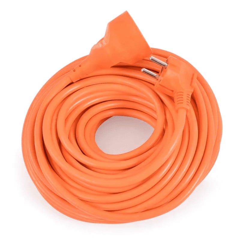 Forlængerkabel 230 V / 50 Hz 20 m langt, kabel tværsnit er 3 x 1,5 mm 2. Fremstillet i transparent orange er den derfor let synlig i græsset, hvilket reducerer risikoen for utilsigtede skader markant.
