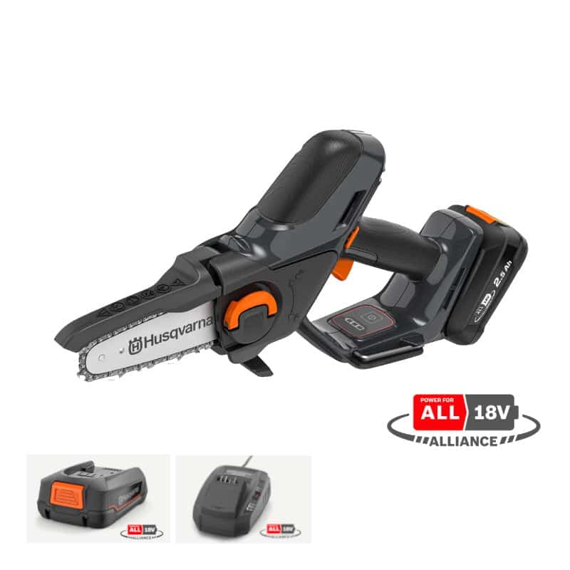 Kompakt håndholdt batteridrevet håndsav, perfekt til beskæring af træer, nedskæring af haverester og mindre snedkerarbejde. Denne all-round mini-kædesav er bygget på vores gennemprøvede kædesavsekspertise og er robust nok til nemt at skære 75 mm brede grene.